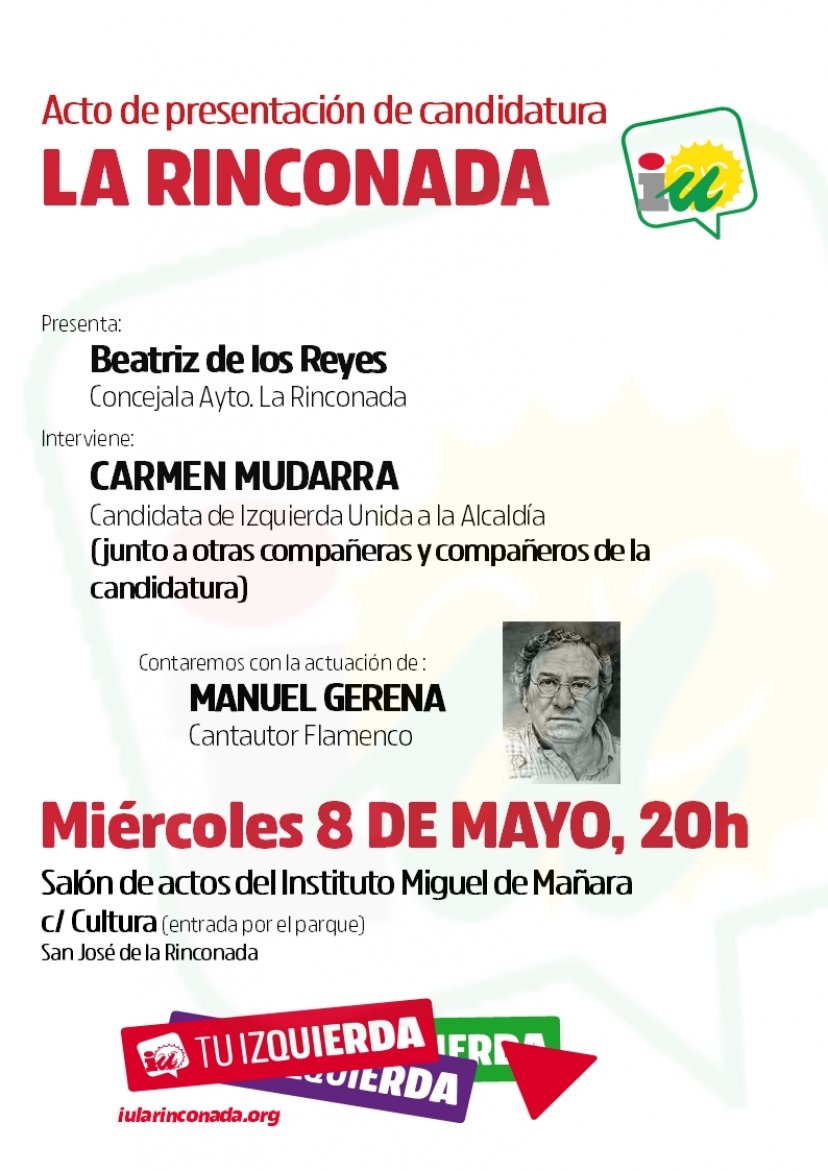 Izquierda Unida La Rinconada presenta a las vecinas y vecinos a sus candidatas y candidatos para las próximas Elecciones Municipales. Este evento será presentado por Beatriz de los Reyes (actual Concejala del Ayuntamiento) e intervendrán la candidata a la Alcaldía, Carmen Mudarra, así como otros miembros de la candidatura.