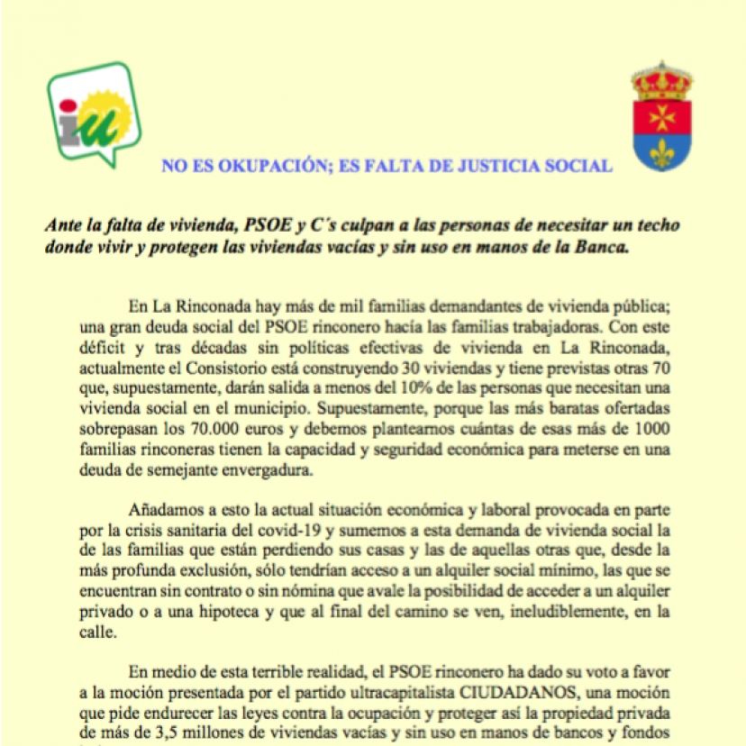 Aquí abajo en Descargar archivos adjuntos puedes encontrar el PDF completo "NO ES OKUPACIÓN; ES FALTA DE JUSTICIA SOCIAL" que comienza con lo siguiente: "Ante la falta de vivienda, PSOE y C ́s culpan a las personas de necesitar un techo donde vivir y protegen las viviendas vacías y sin uso en manos de la Banca..."