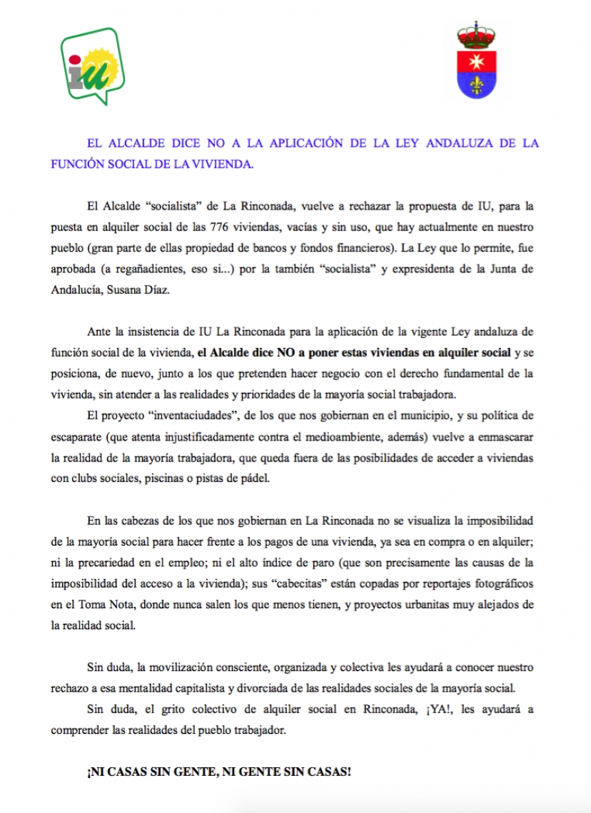 El Alcalde “socialista” de La Rinconada, vuelve a rechazar la propuesta de IU, para la puesta en alquiler social de las 776 viviendas, vacías y sin uso, que hay actualmente en nuestro pueblo (gran parte de ellas propiedad de bancos y fondos financieros). La Ley que lo permite, fue aprobada (a regañadientes, eso si...) por la también “socialista” y expresidenta de la Junta de Andalucía, Susana Díaz.