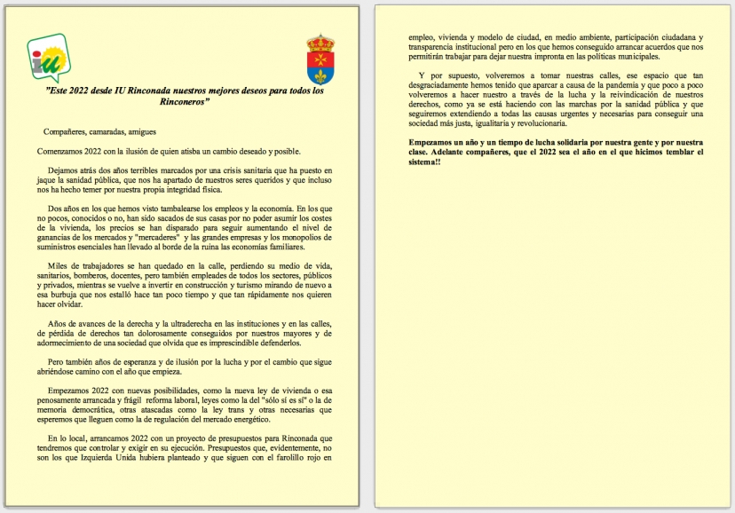 En lo local, arrancamos 2022 con un proyecto de presupuestos para Rinconada que tendremos que controlar y exigir en su ejecución. Presupuestos que, evidentemente, no son los que Izquierda Unida hubiera planteado y que siguen con el farolillo rojo en