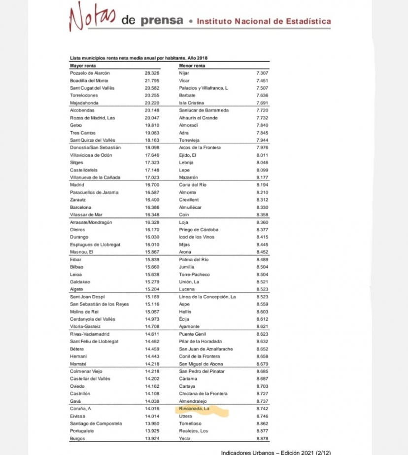 Según el Instituto Nacional de Estadística (INE), La Rinconada está en el puesto n°46, de entre los 416 municipios de más de 20.000 habitantes, con menor renta económica por persona del país.